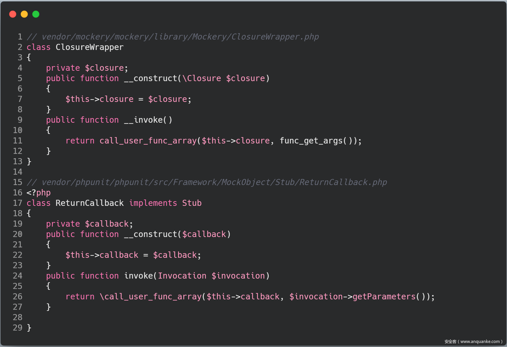 通过直接搜索 call_user_func_array 函数,我们会发现两个比较好利用的类函数。但是这里的第一个 ClosureWrapper 类我们无法利用,所以得利用 ReturnCallback 类的 invoke 方法,具体代码如下: