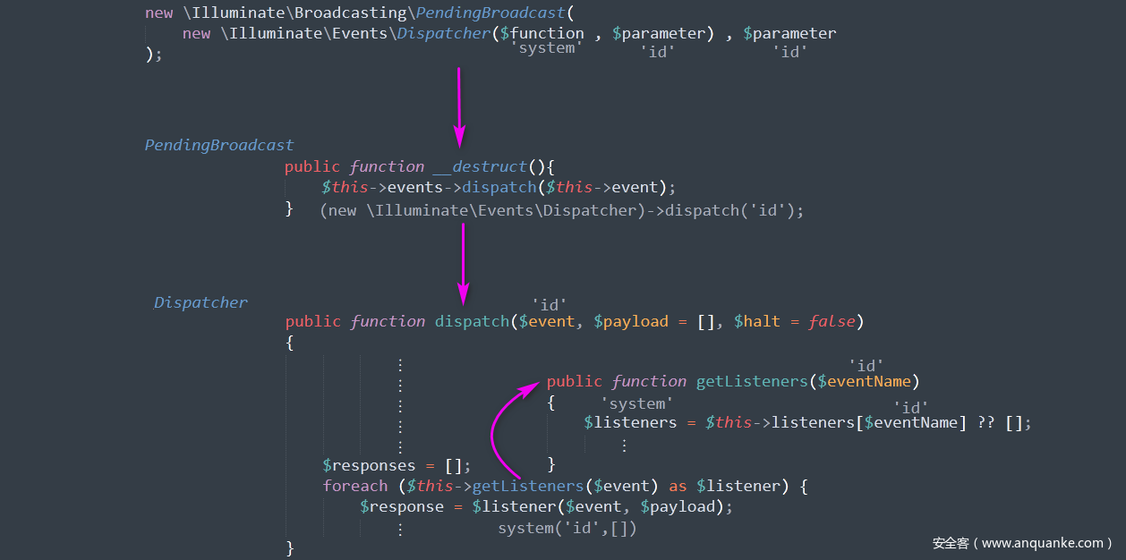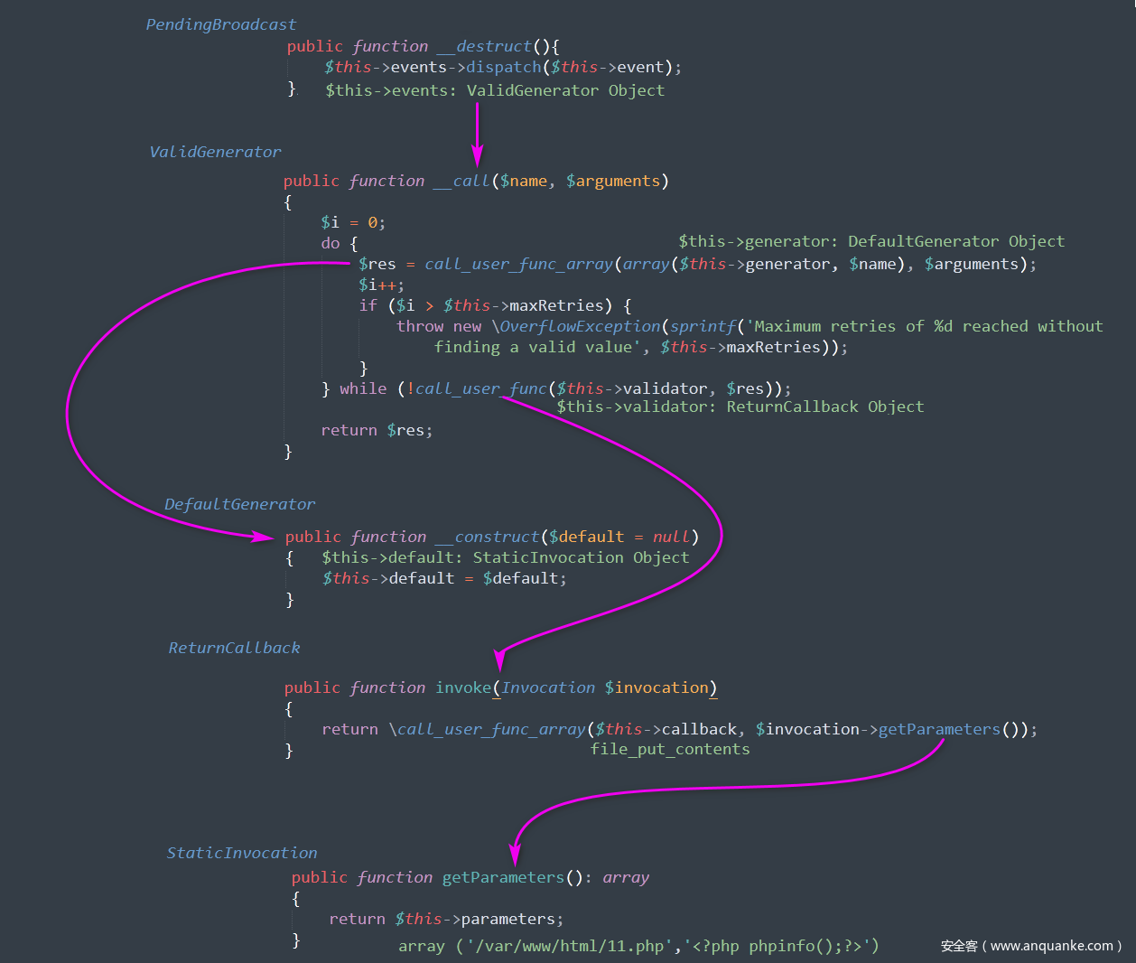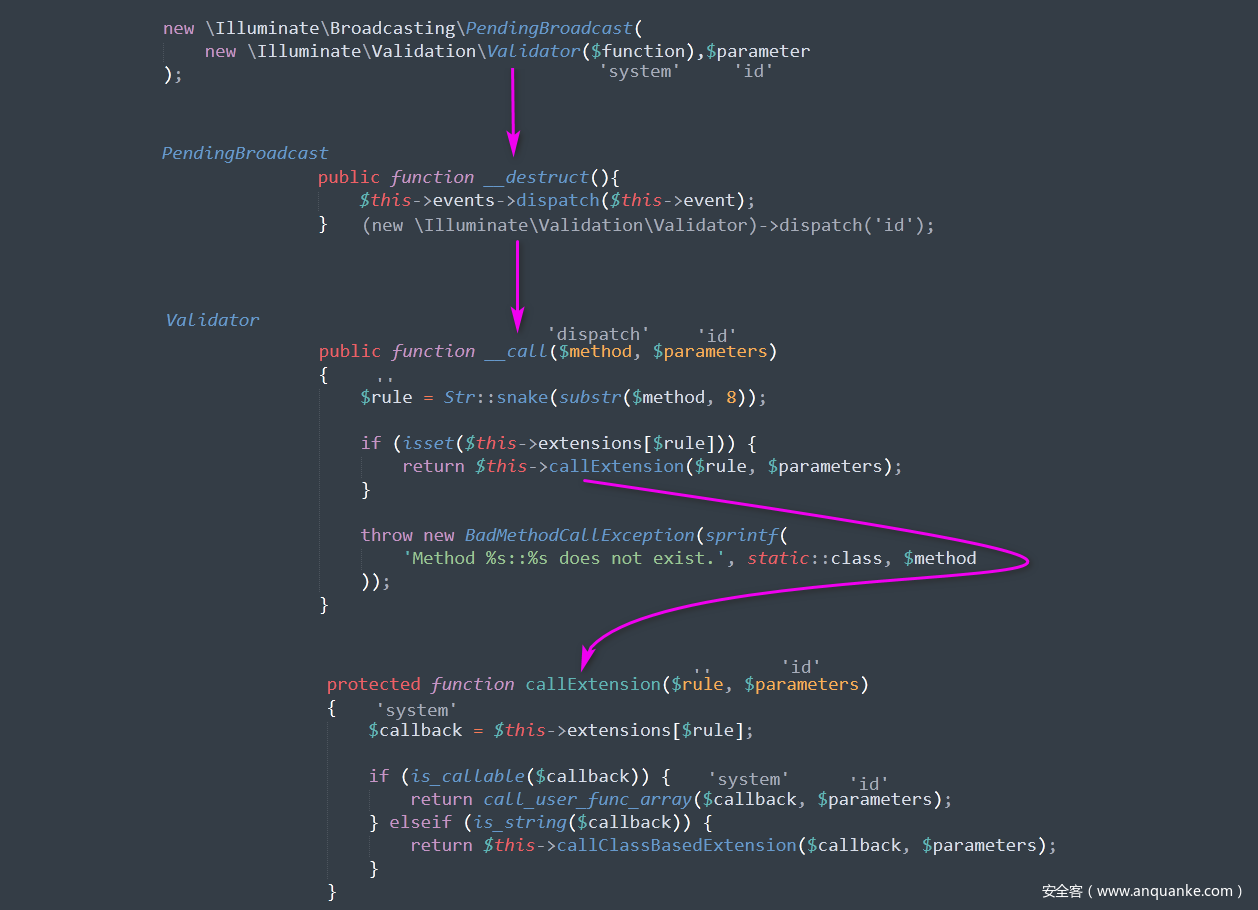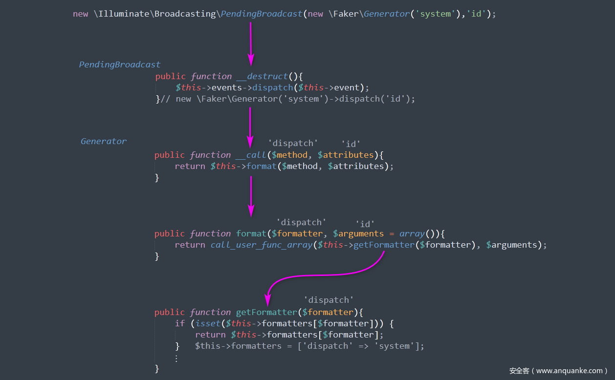 我们可以发现上面的4种 RCE 入口点都是从 PendingBroadcast 类的 __destruct 方法开始的,那么我们着重搜索 dispatch 方法和 __call 方法。经过一番搜索,发现 ValidGenerator 类中的 __call 比较好利用。