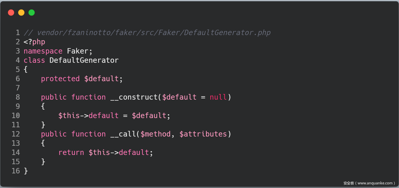 我们接着搜索可以用于控制 call_user_func_array 函数执行结果的类,这里我找到了 DefaultGenerator 类的 __call 方法,我们可以看到返回值 $this->default 完全可控。