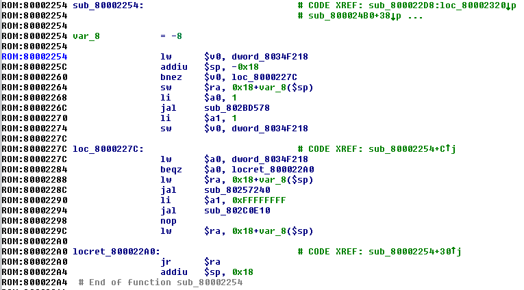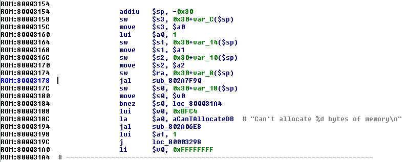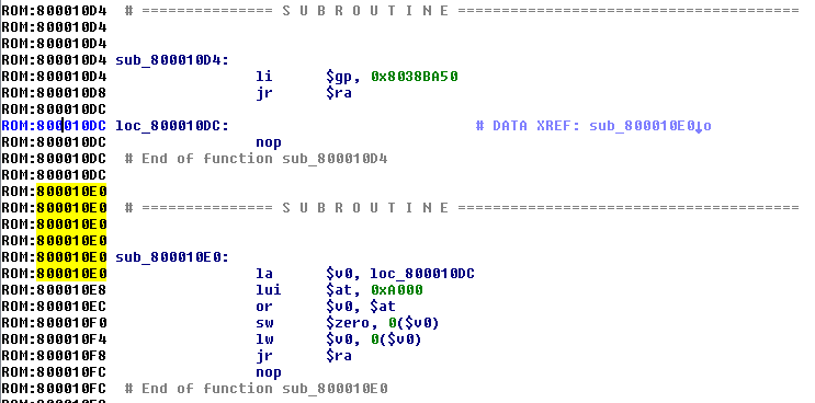 因为这些节看起来都是以jr $ra(mips的返回指令)结束,并且由于它们没有被其他的函数所使用,它们可能是自身调用的函数(since they are not referenced by the surrounding functions, they are likely functions themselves. )(译者注:不太理解这句话,怕误导,所以将原文贴出)