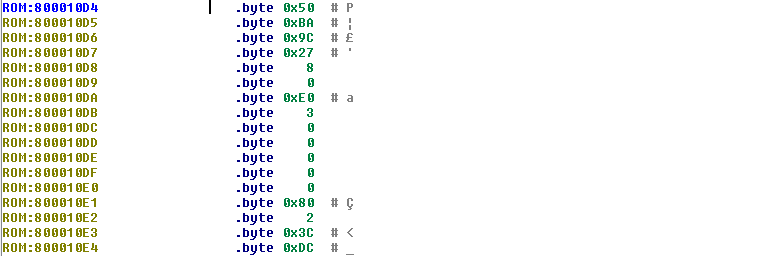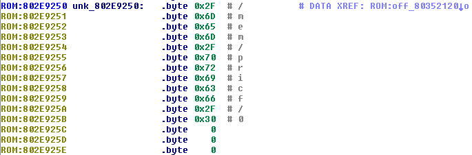 随着完成对代码的处理,我们将注意力转向字符串。没有像ELF文件中的符号,我们不得不依赖字符串的引用来提供对于固件中的事件的理解。但是仍然有一些ascii字节的数组没有被IDA转换成字符串: