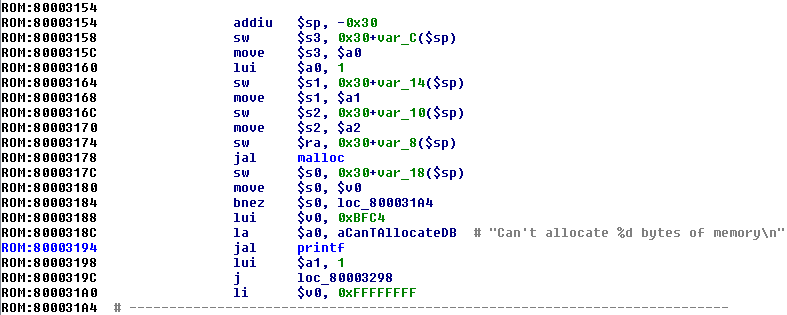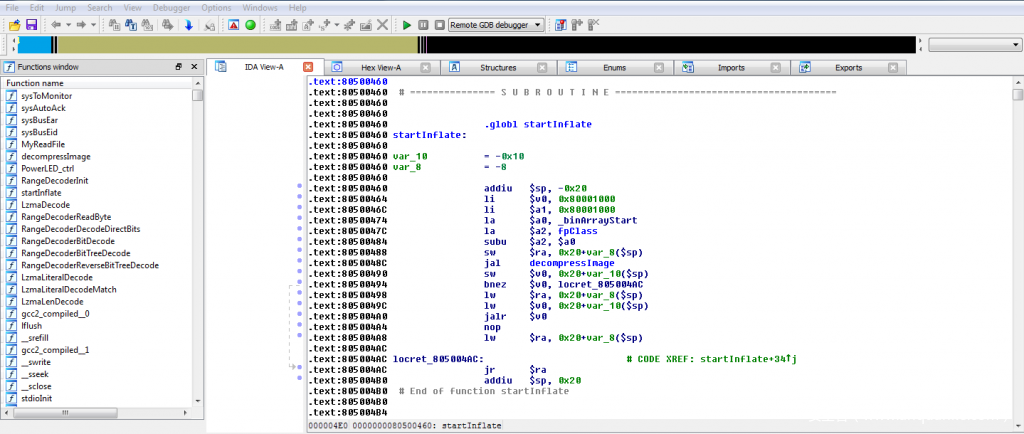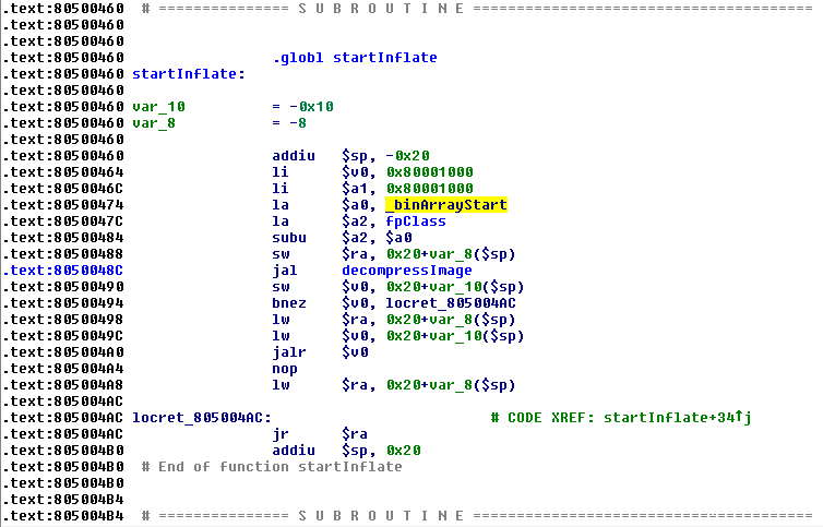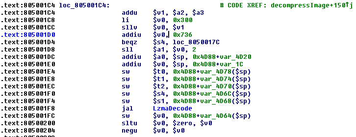 所以看起来是我们之前提取的LZMA数据包含可执行代码,这些数据被解压然后载入到地址0x80001000中,google搜vxworks lzmadecode出来的源码(译者注:这个链接已经失效了)证明了这个结论。