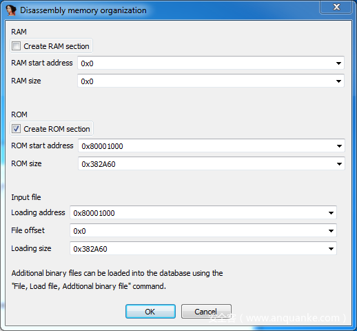 我们将ROM的开始地址设置为0x80001000,把size设置成文件的size0x382A60,同时把loading address设置为0x80001000。如下图所示: