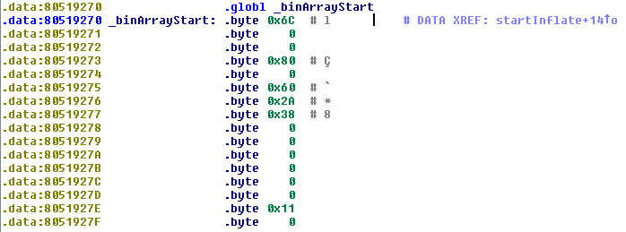查看decompressImage函数的参数,第一个参数是_binArrayStart,第二个地址是0x80001000。让我们看下_binArrayStart:
