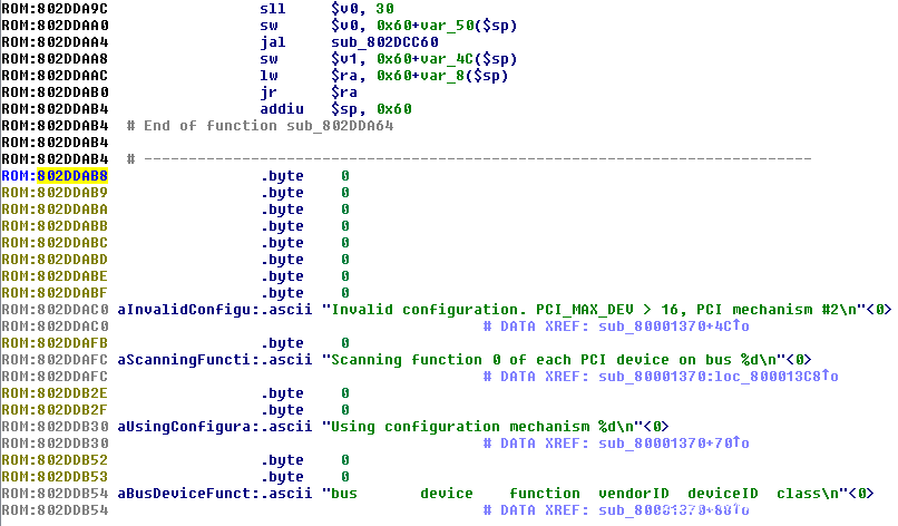将这些ascii字节的数组转换成字符串将会使得代码的可读性更强,因此create_ascii.py脚本是将ascii字节的数组转换成字符串。我们之前看到的是,包含字符串的数据地址开始于0x802DDAC0,因此我们将开始的地址设定为该地址,并运行脚本。运行的结果相较于之前又了一定的提升: