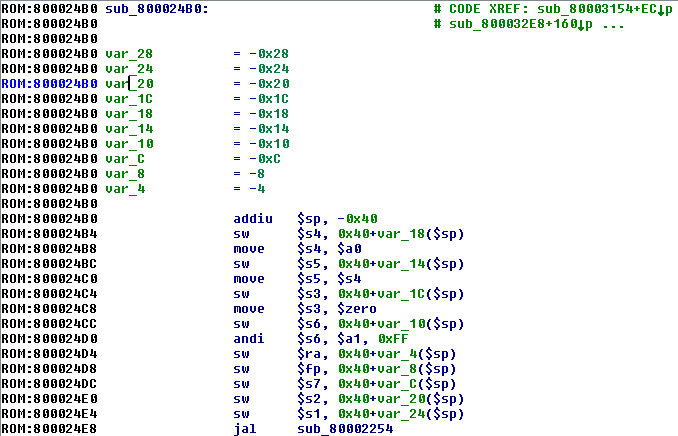addui指令经常在函数最开始被用来操作栈桢寄存器$sp,我们可以在IDA中看到很多的函数是这样的: