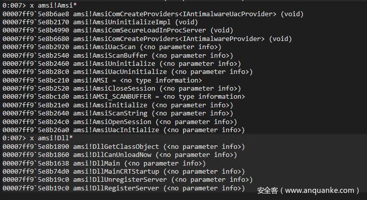 使用WinDbg时,我们可以列出AMSI导出函数及内部函数,如下图所示。其中x命令用来检查符号。符号文件是编译程序时创建的文件,程序运行并不需要这些文件,但其中包含调试过程中需要的许多有用信息,比如全局变量、本地变量、函数名及地址等。