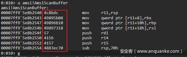 我们可以使用WinDbg软件来反汇编AmsiScanBuffer函数,以获取该函数对应的指令。需要注意的是,u选项可以用来反汇编内存中的特定代码,这里即为AMSI DLL中的AmsiScanBuffer。