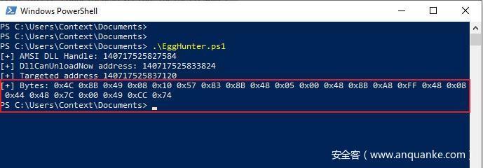 如上图所示,我们找到的字节刚好是AmsiScanbuffer函数的前24个字节,因此,我们可以使用这种技术成功动态发现AmsiScanBuffer。