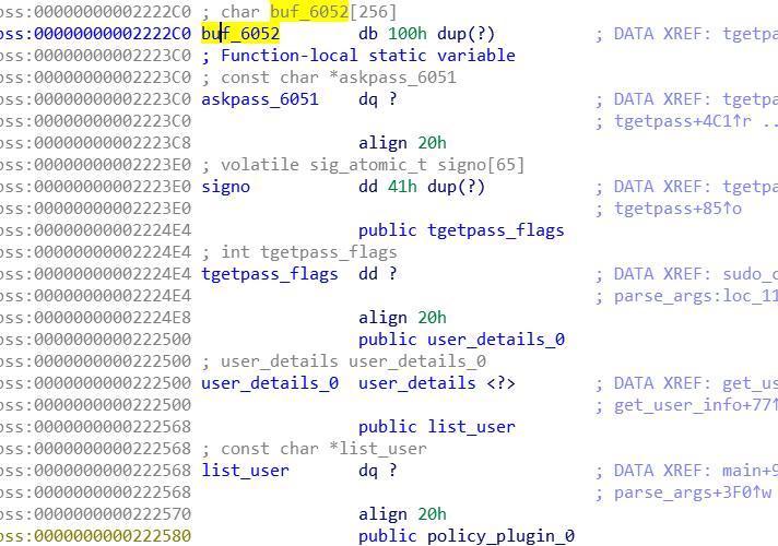 buf 在 tgetpass函数定义,是static 类型,存放在内存的bss段上,所以可能可以溢出覆盖bss的一些内容