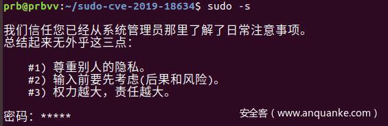 我们知道,默认情况下 sudo -s 可以有三次输入密码的机会,这个也是可以利用的点,基本利用流程如下