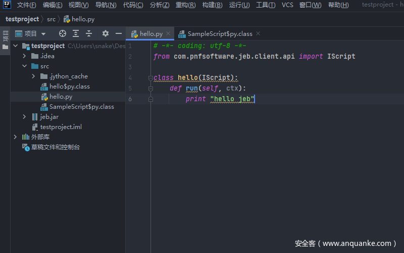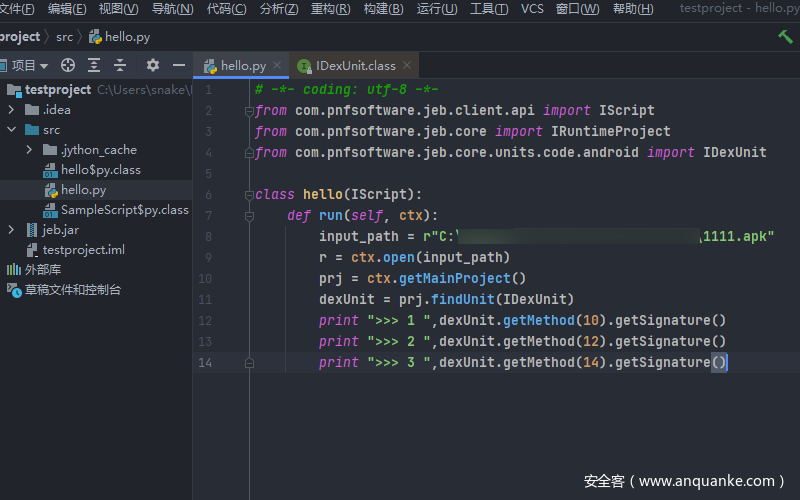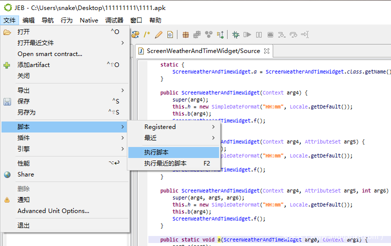 然后在JEB中通过”脚本-执行脚本”,执行hello.py文件