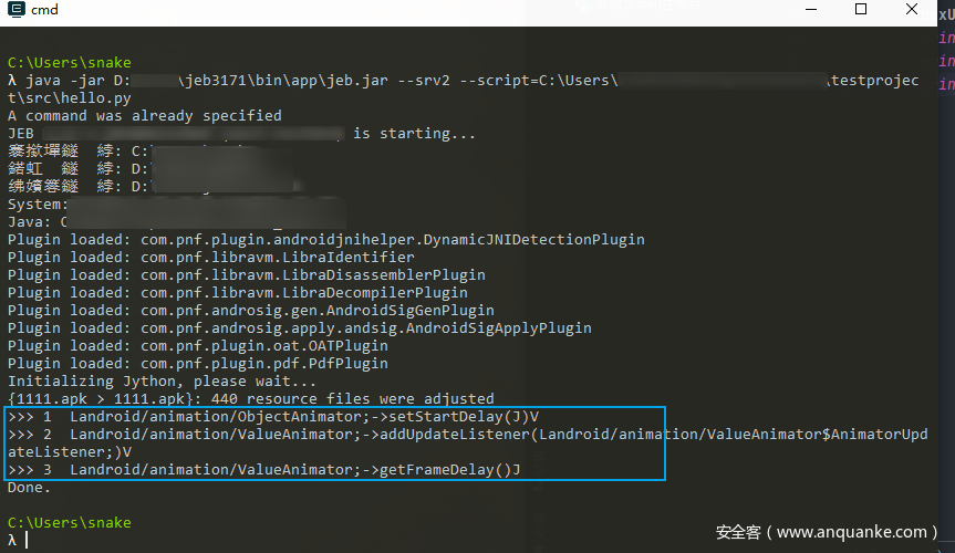 java -jar “jeb根目录\bin\app\jeb.jar” —srv2 —script=hello.py