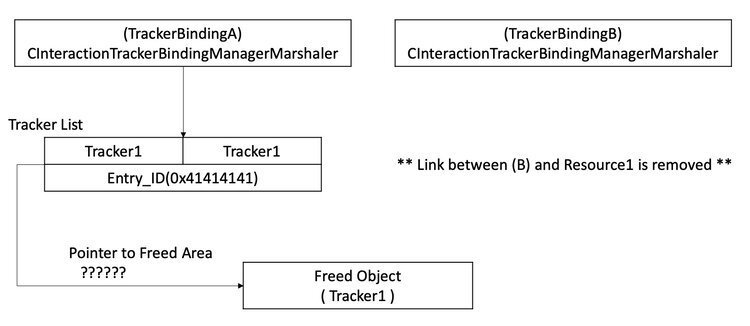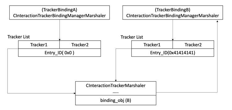 现在,CInteractionTrackerMarshaler对象的binding_obj被设置为零,这可以绕过CVE-2020-1381的补丁。如果我们将tracker1绑定到另一个CInteractionTrackerBindingManagerMarshaler对象,状态会发生如下变化。