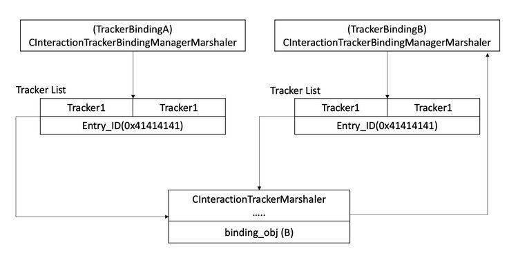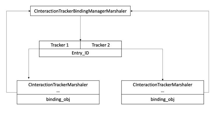 接下来,这对CInteractionTrackerMarshaler资源被附加到CInteractionTrackerBindingManagerMarshaler对象的跟踪器列表中。如名称所示,这两种对象类型CInteractionTrackerMarshaler和CInteractionTrackerBindingManagerMarshaler是相互关联的。CInteractionTrackerBindingManagerMarshaler对象保存了CInteractionTrackerMarshaler对象对的列表,并且每个CInteractionTrackerMarshaler对象都有一个返回到CInteractionTrackerBindingManagerMarshaler对象的指针。