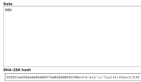 比如,回到前面那个哈希计算网站,输入“886”后我们可以得到前缀为3个0的哈希值。