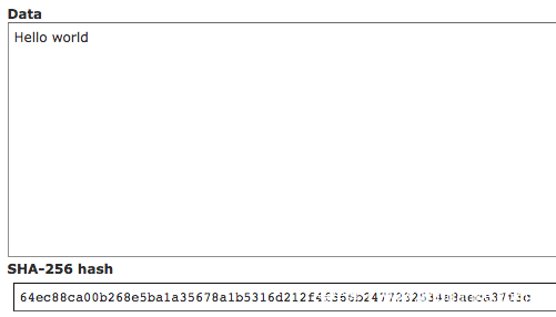 以非常流行的SHA-256算法为例,我们可以使用哈希生成网站来生成SHA-256哈希值。比如,我们可以输入“Hello world”,观察对应的哈希结果: