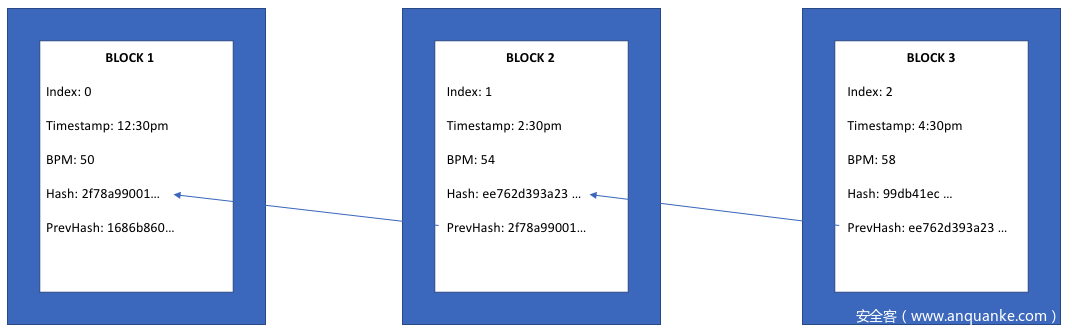 如果你看过我们前面那篇<a href=”https://medium.com/@mycoralhealth/code-your-own-blockchain-in-less-than-200-lines-of-go-e296282bcffc”>文章,那么对下面这张图应该不会感到陌生。我们使用散列算法来验证区块链中区块的正确性,具体方法是将某个区块中的previous hash与前一个区块的hash进行对比,确保两者相等。这样就能维护区块链的完整性,并且恶意成员无法篡改区块链的历史信息。