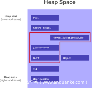 如果我们有这样的应用程序,只需从上面发送我们生成的恶意格式字符串,就可以从应用程序中提取尽可能多的数据。这允许我们读取并且可能提取存储在存储器中的所有秘密(数据库凭证,令牌),还有那些仅通过应用程序(在并发请求中的客户信用卡号码或用户会话)转移的数据。