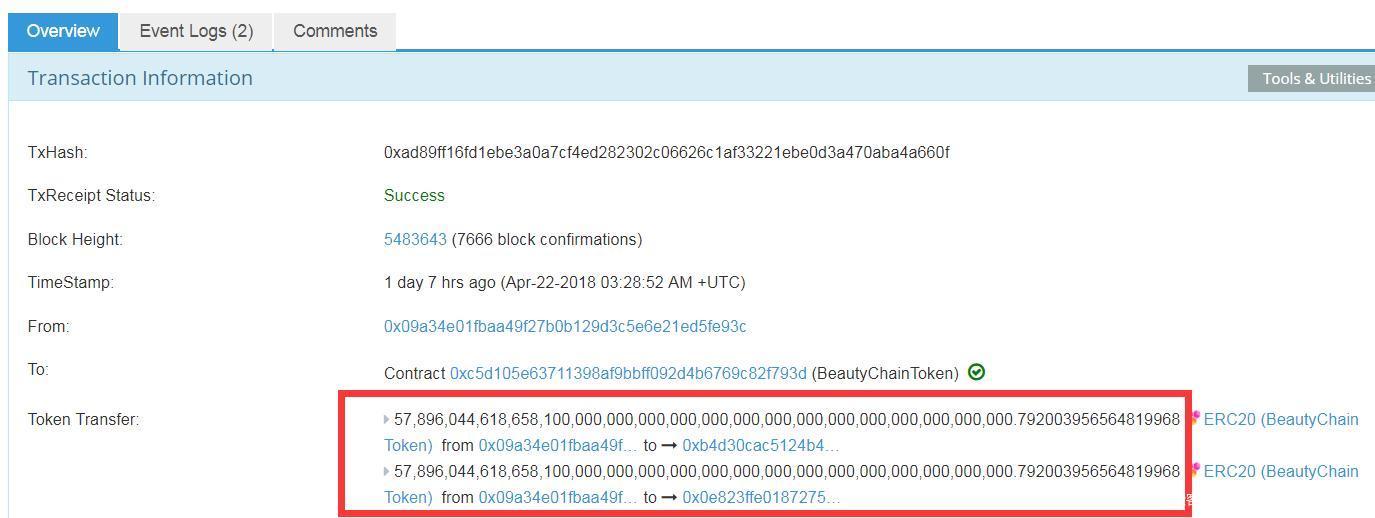 但是攻击者通过溢出amount绕过后续require中的判定条件分别向两个地址恶意转账了 57,896,044,618,658,100,000,000,000,000,000,000,000,000,000,000,000,000,000,000.792003956564819968枚bec代币。