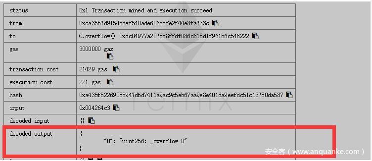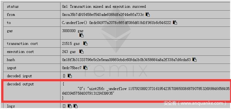 可以看到uint256当取最大整数值,上溢之后直接回绕返回值为0,uint256当取0下溢之后直接回绕,返回值为2^256-1。这是solidity中整数溢出场景的常规情况。