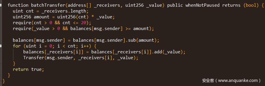 可以看到batchTransfer函数中,语句balances[msg.sender] = balances[msg.sender].sub(amount)和balances[_receivers[i]] = balances[_receivers[i]].add(_value)中,调用Safemath库中的安全函数来完成加减操作,但是在第三行代码, uint256 amount = uint256(cnt) * _value却直接使用乘法运算符。