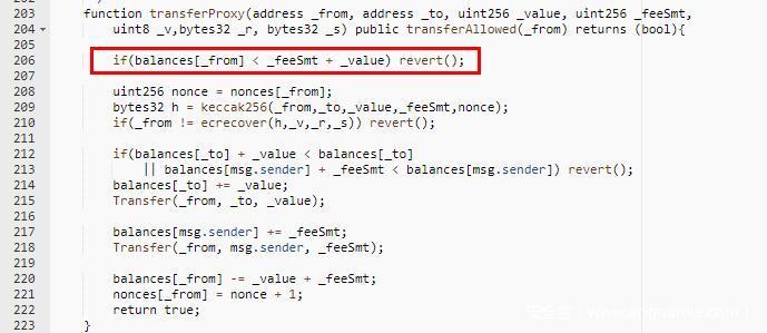 在进行加法操作的时候没有采用Safemath库进行约束。_feeSmt参数和_value参数均可以被外界进行控制, _feeSmt和value均是uint256无符号整数,相加后最高位舍掉,结果为0。