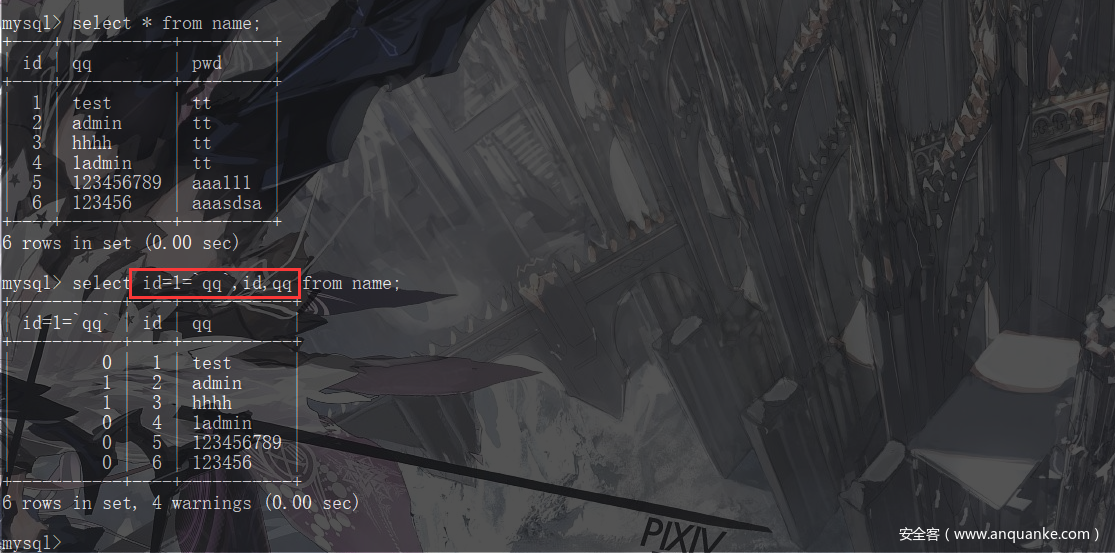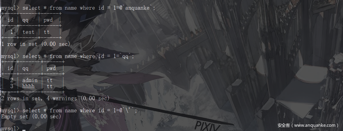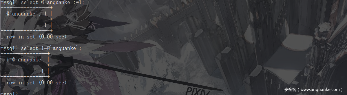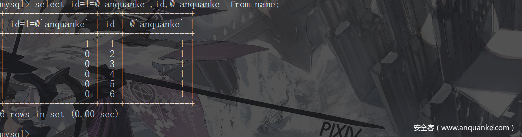 可以发现,在mysql中where条件部分处理的逻辑顺序是,先将所有id与1比对,相同返回1,1与后面的变量@`anquanke`进行比较,相同则返回1。同样的道理id=1=`qq`是id=1返回的结果与字段qq中的值进行比较,这里存在类型转换(0=’admin’)。至于@`’`无返回结果,因为该变量用户并没有定义所以不存在为NULL。
