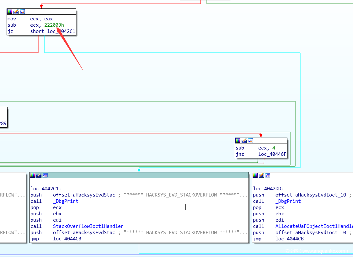 找到之前准备好的HackSysExtremeVulnerableDriver.sys,里面有一个准备好的带有栈溢出的函数,叫做StackOverflowIoctlHandler。我们通过逆向,找到对应触发函数的IOCTL: