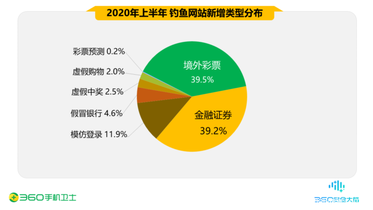 2020年上半年度,360安全大脑共截获各类新增钓鱼网站2416.3万个,其中,境外彩票类占据首位,占比39.5%;其次为金融证券类,占比39.2%。第一季度受疫情原因影响,部分大众收入来源遭受影响,导致贷款诈骗案件频发。