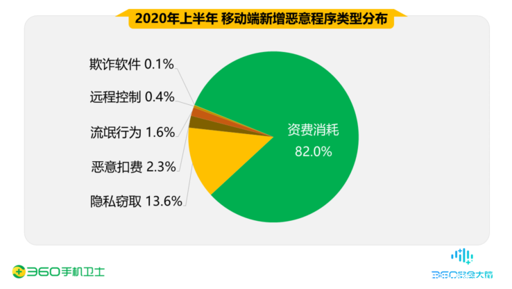 2020年上半年度,360安全大脑共截获移动端新增恶意程序样本约104.8万个,平均每天截获新增手机恶意程序样本约0.6万个。其中,资费消耗类占比82.0%。色情视频APP为主要“工具”。