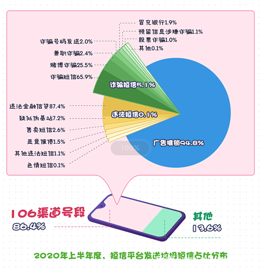 2020年上半年度,360手机卫士共为全国用户拦截各类垃圾短信约74.9亿条,垃圾短信的类型分布中广告推销短信最多,占比为94.8%。短信平台106开头号段依然是传播垃圾短信的主要号源,占比高达86.4%;