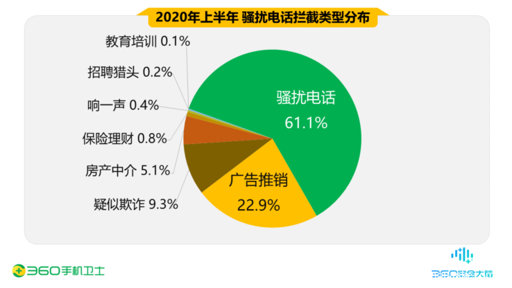 2020年上半年度,360手机卫士共为全国用户识别和拦截各类骚扰电话约98.3亿次,平均每天识别和拦截骚扰电话约0.5亿次。2020年第一季度疫情爆发时期,骚扰电话的传播似乎并没有受到疫情影响,依旧呈现高发态势。