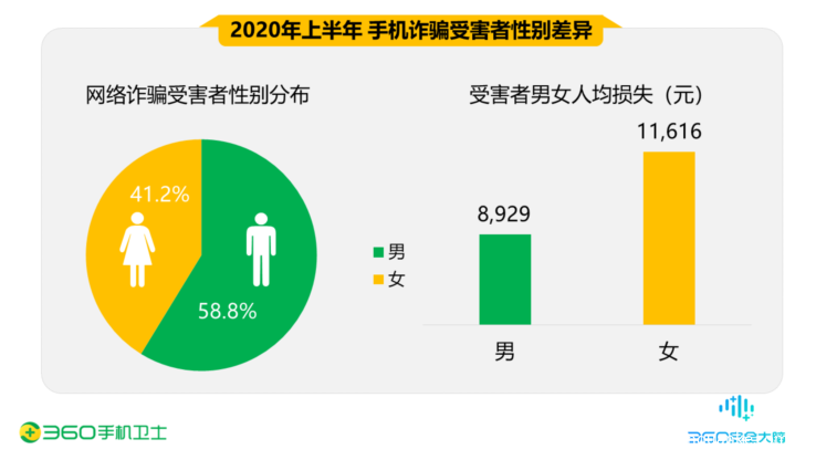 2020年上半年度,从举报用户的性别差异来看,男性受害者占58.8%,女性占41.2%。从人均损失来看,男性为8929元,女性为11616元。