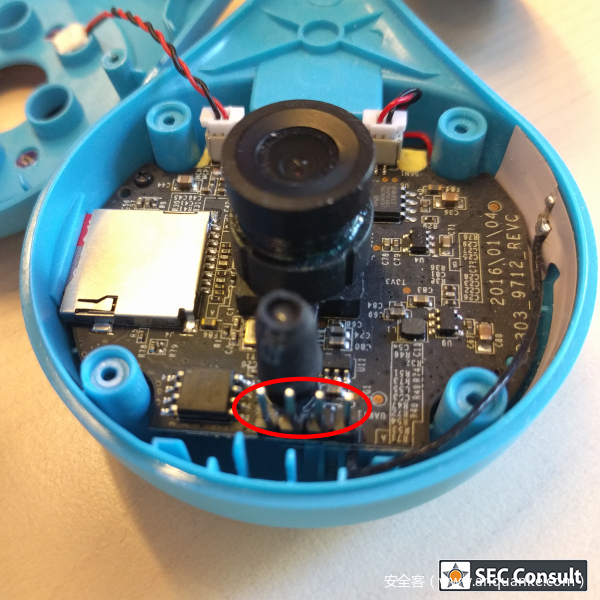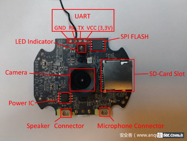 下图显示的是视频婴儿监视器的背面内部结构,包括PCB板以及UART接口等等: