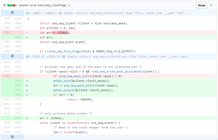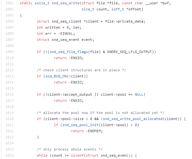 该漏洞的触发点位于 /sound/core/seq/seq_clientmgr.c文件的 snd_seq_write函数中。如下所示,在该函数的1021行中,当第一次写操作发生并且事件池为空时,会调用 snd_seq_pool_init函数对事件池进行初始化。