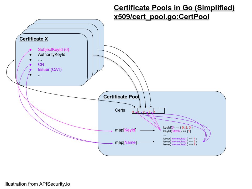 为了澄清问题机理,我们需要理解服务端如何管理证书池,以便通过高效的方式来验证证书。证书池实际上就是一个证书列表,可以根据实际需求通过3种不同的方式来访问。一种访问方式如下图所示:池中证书可以通过索引数组(这里为Certs)来访问,以CN, IssuerName, SubjectKeyId字段作为哈希字段。