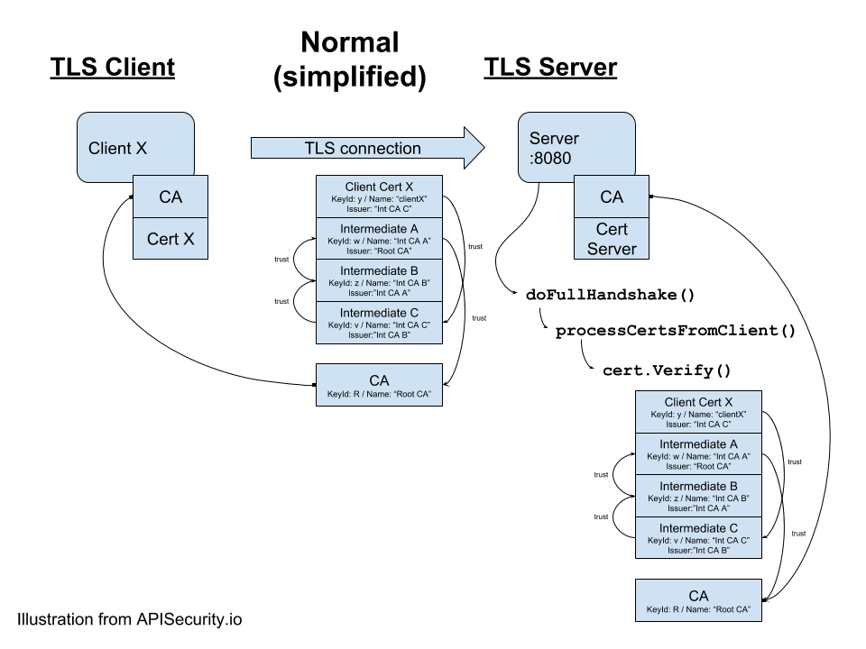 findVerifiedParents(client_certificate),查找待验证证书的签发机构(判断是否为root CA),然后根据AuthorityKeyId(如果不为nil)或者原始的issuer值(如果为nil)检查所有找到的证书的签名 - 在(客户端提供的)中间CA池上调用
