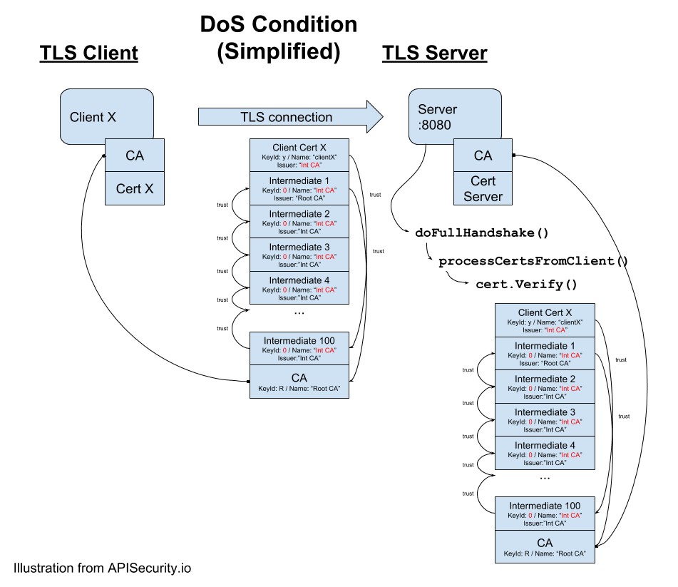 crypto/x509包负责解析并验证X.509编码的密钥和证书,正常情况下会占用一定的资源来处理攻击者提供的证书链。