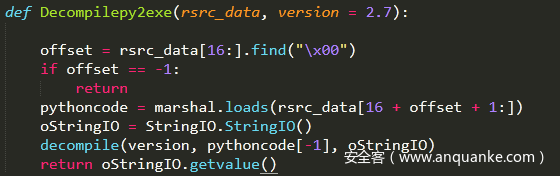 关于脚本提取的方法,可以用python的PEFile库去解析PE文件,提取PYTHONSCRIPT资源,也可以用工具把资源dump出来。提取过后,几行简单的脚本就可以还原出python代码了。下面的这个函数就可以完成PYTHONSCRIPT流的解析工作。