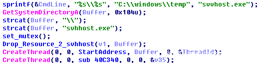 首先, 自身移动到C:\Windows\Temp目录下,重命名为svhhost后,拼接字符串”C:\Windows\Temp\svvhost.exe”为蠕虫的自我复制和版本升级做准备。