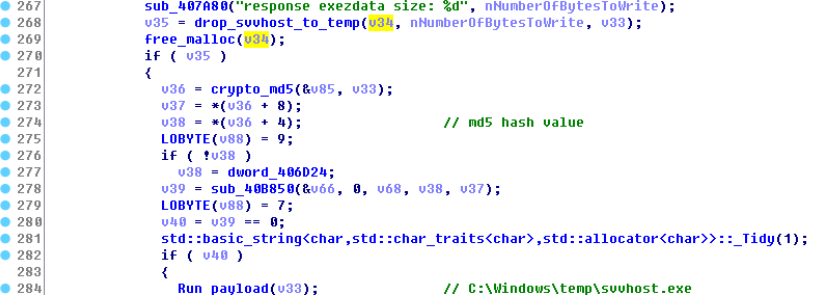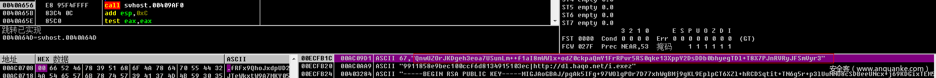 在调试过程中,我发现svvhost确实有更新:利用代码提取python脚本后,发现了数个版本的shellcode,有一部分shellcode在调试过程中可能会发生崩溃的情况。其中一个版本的shellcode 执行的是下载hxxp://dl.haqa.net/dll.exe的指令。 对这个样本进行分析发现除了部分样本加壳,样本移动自身的位置变为C:WindowsSystem32driverssvchost.exe,新调试的样本还会将hxxp://p.abbny.com 作为C2服务器外,就没什么其他变化了。