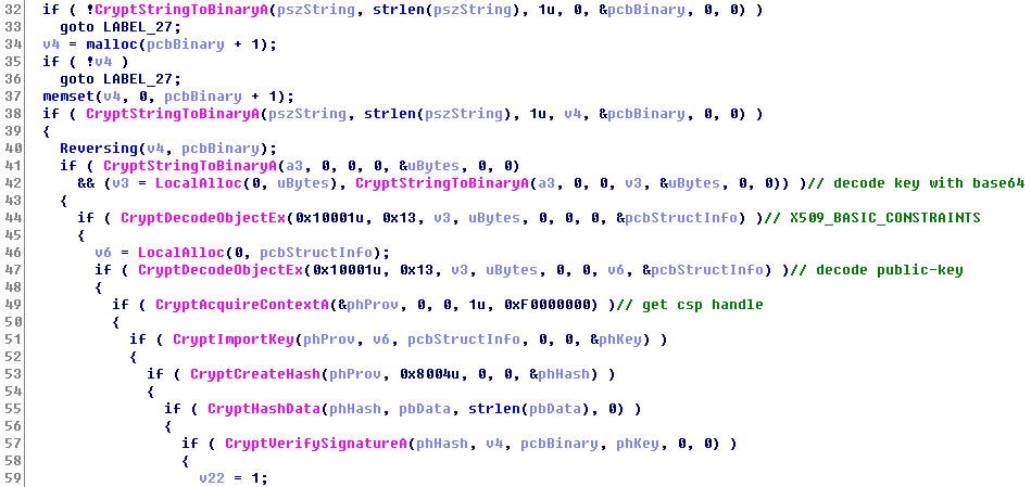 而第二段则是客户端和服务端的通信校验,在代码执行下载动作前,需要对通信数据的有效性进行校验,大致流程是:首先对第二部分数据包进行base64解码,然后逆转字符数组作为私钥,和硬编码的公钥进行密钥对的验证。静态代码如下: