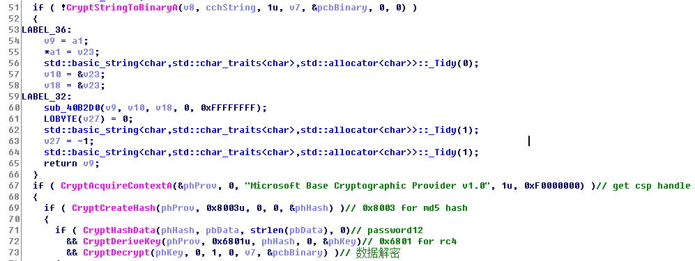 上图就是实际调试过程中捕获的数据包,这段数据包两部分,$符分隔。首先第一部分数据包进行base64解码,然后对解码的数据利用password12进行rc4解密,得到一个带下载样本的md5 和一个url。