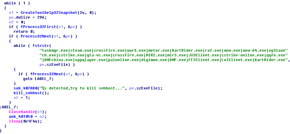 然后创建两个线程,一个线程用来检查自我复制是否成功,另一个线程则会检查系统当前是否有部分游戏进程,如果存在则结束svhhost进程。