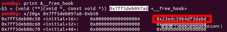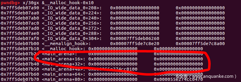 __free_hook地址-0xb58的位置,红框内可以作为我们伪造的top chunk的size。我们只需要将指向top chunk的指针指向__free_hook地址-0xb58的位置就可以了。