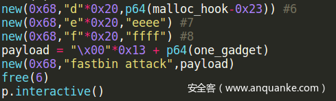 首先,我们知道,__malloc_hook和main_arena其实是相邻的,并且main_arena里面有一个指向top chunk的指针。这样的话我们可以先fastbin dup去申请到__malloc_hook-0x23这块内存,然后往main_arena里面写入0x70,再用fastbin attack得到main_arena,控制top chunk的指针指向__free_hook上方,然后再去不断申请内存直至申请到__free_hook。