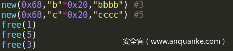 首先先去申请5个chunk和泄露堆的地址,大小分别有0x68和0xF8的